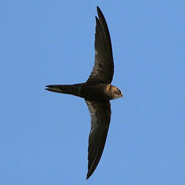 鸣叫特征:主要鸣声为飞行中发出的尖锐、带金属质感的拖长“pzzeeeeerrurrr”,音调在末尾骤降,主频5.5–6.5 kHz,尾频降至3–4 kHz,持续0.5–0.9 s;与普通雨燕相比更带沙哑、更延长。另有短促的起伏“rreerrurr”,呈倒V形声谱,约0.25–0.3 s,常与前述尖叫混用。A. b. sladeniae的叫声疑似为短促高频“bzee”,声谱形态迥异。繁殖群在日出后及傍晚于巢区上空最为嘈杂。