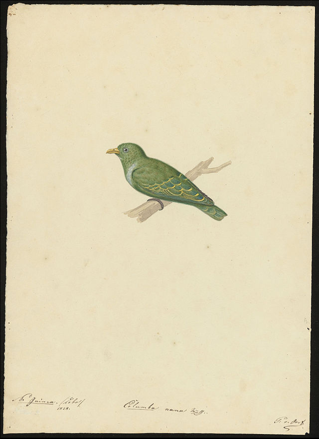 小绿果鸠(英文名:Dwarf Fruit Dove,学名:Ptilinopus nainus),是鸽形目鸠鸽科果鸠属的鸟类,是全球最短小的鸽子或果鸠,体长仅13-15厘米。该鸟主要栖息于新几内亚及四王群岛的低地和山脚雨林,以绿色为主色调,腹部和尾下覆羽鲜黄,雄鸟胸部有独特的紫色斑块。