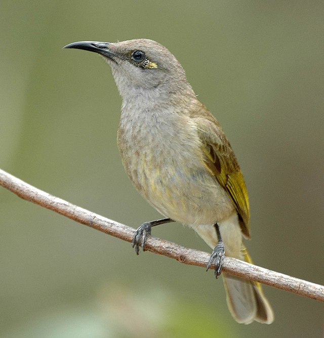 区别辨识:与Dusky Honeyeater(灰岩吸蜜鸟)幼鸟易混淆,但后者更暗,无翼部黄色斑块。各亚种间差异细微,主要体现在色彩深浅和嘴尾长度上。