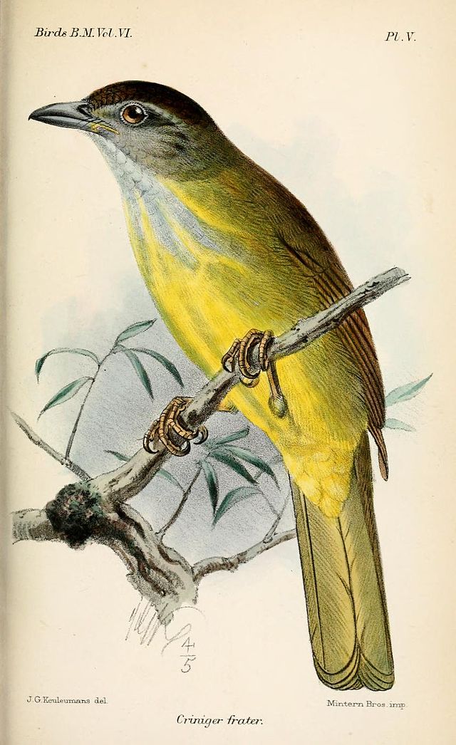 其他:曾被归入Lanius和Criniger属,2009年移至Alophoixus属。曾用名包括灰颊冠鹎和灌木鹎。