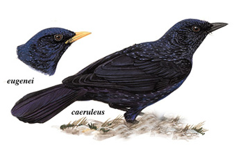 外形特征:紫啸鸫体型大,约31-35厘米长,体重136-231克。全身呈深蓝紫色,带金属光泽,头部至臀部有金属蓝紫色斑点,腹部、翅膀和尾巴为深蓝灰色,中翼覆羽有银灰色斑点。喙色随地理位置变化,中国中部和东部及东南亚部分地区为黑色,其余地区为亮黄色。雌雄相似,但雌鸟色泽较暗淡。幼鸟呈烟黑色,胸羽有白色细纹。